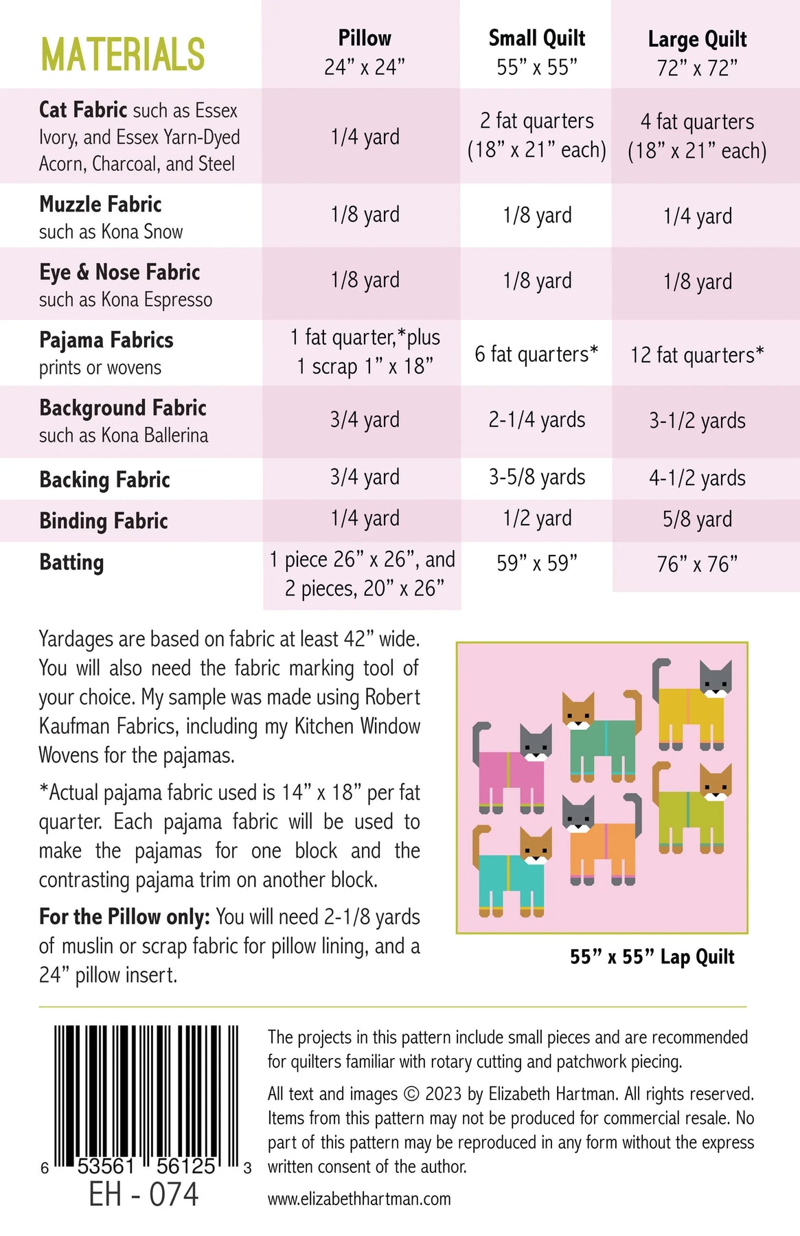 Elizabeth Hartman's Cats in Pajamas is a charming and warm-hearted quilting pattern that uses traditional quilting techniques to create cats in pajamas from your favorite fabrics. The pattern is especially great for fat quarters.