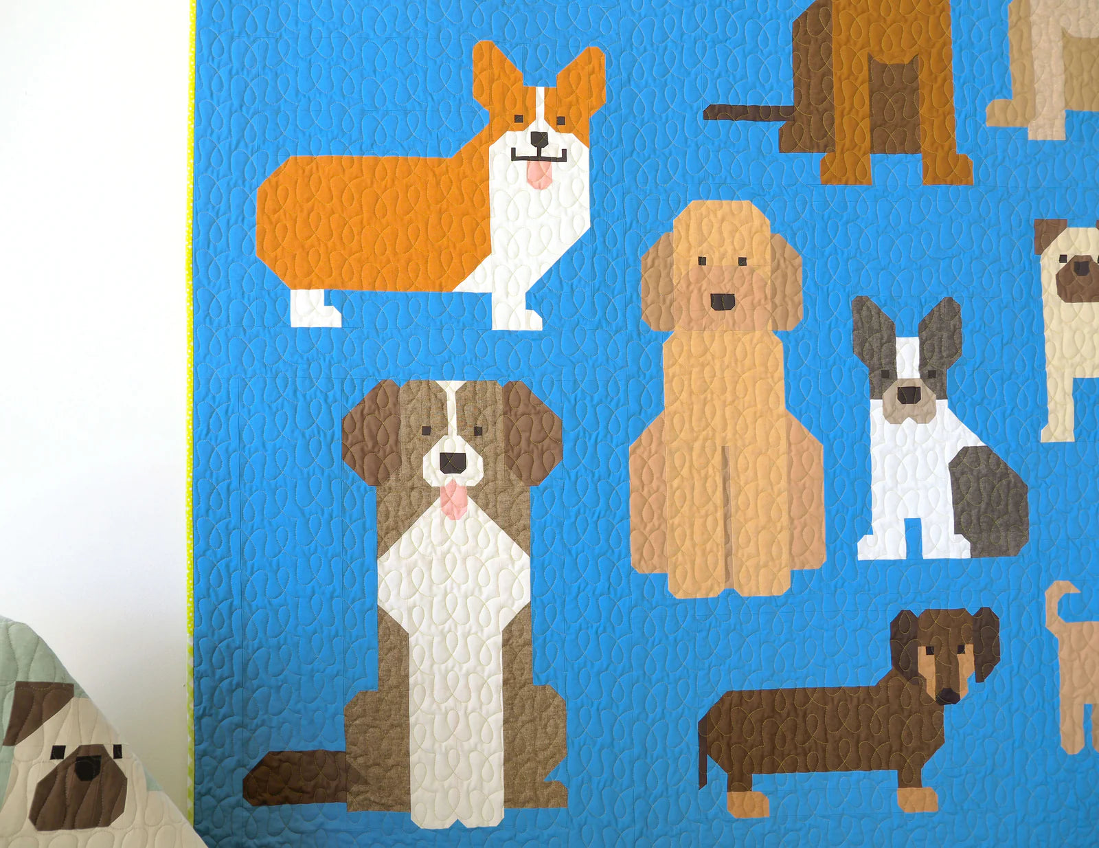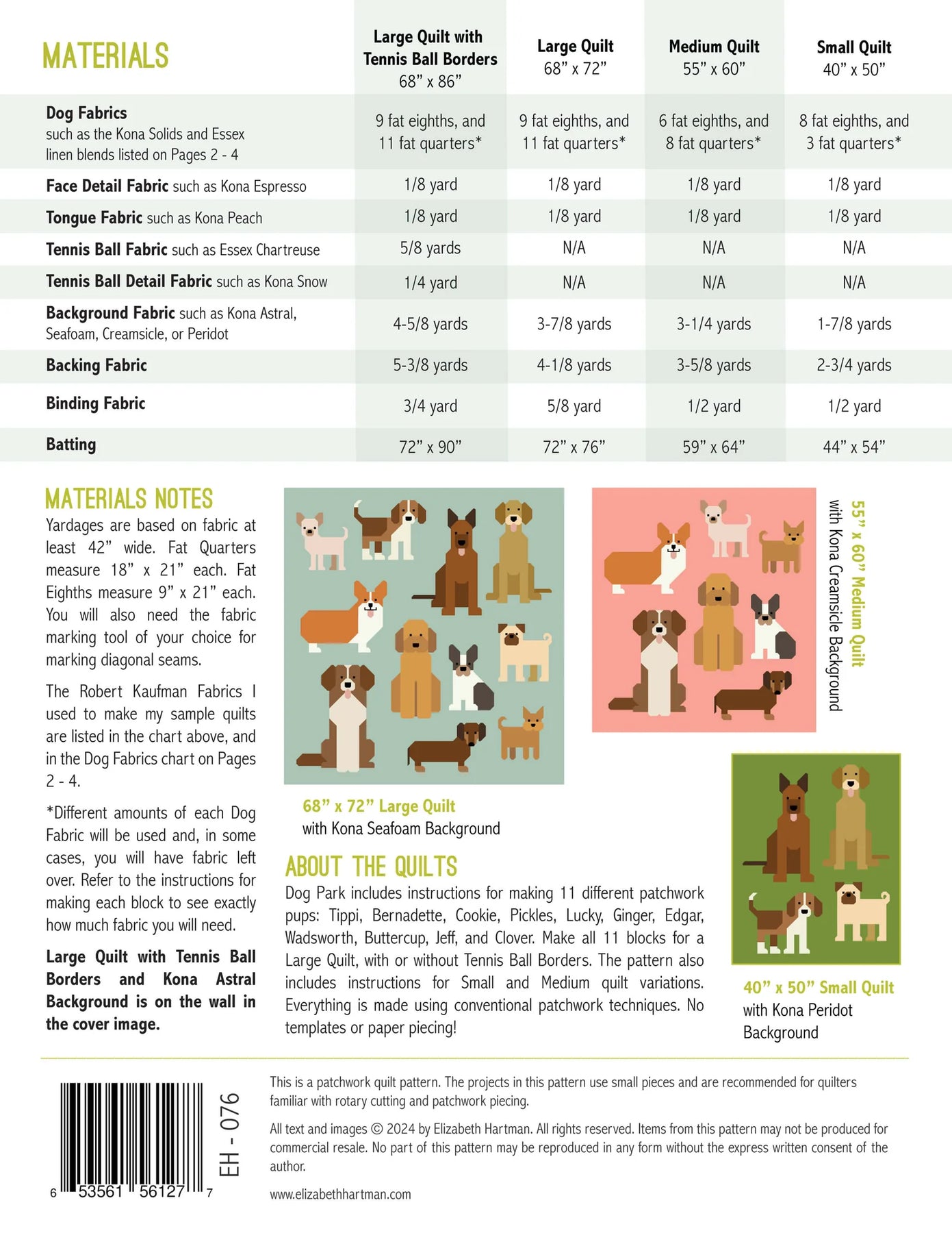 Elizabeth Hartman's Dog Park is a cheerful and personable quilt pattern that features 11 different dog blocks sewn using traditional quilting techniques (no paper piecing). Tippi, Cookie, Bernadette, Pickles, Lucky, Ginger, Edgar, Wadsworth, Buttercup, Jeff and Clover are all ready to play at the dog park!