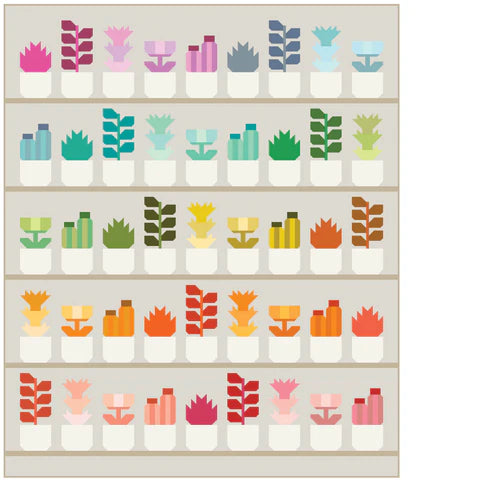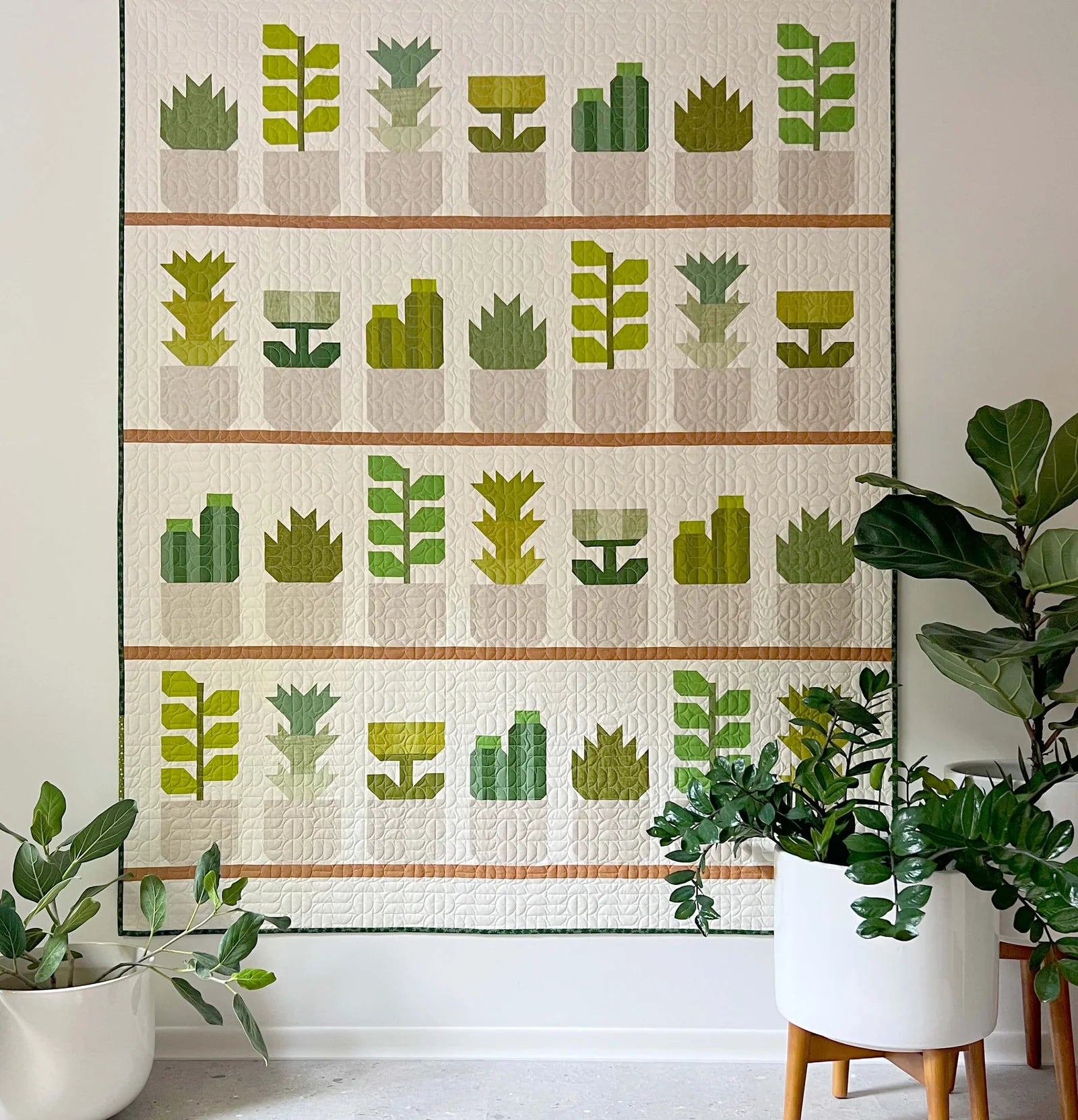 Greenhouse is a modern and fresh quilt pattern by Elizabeth Hartman, where plant-themed blocks form a striking greenhouse-themed quilt. The pattern sews five different plants: Aloe, Jade, Prickly, Flower and Cactus, into clean and modernized pots.