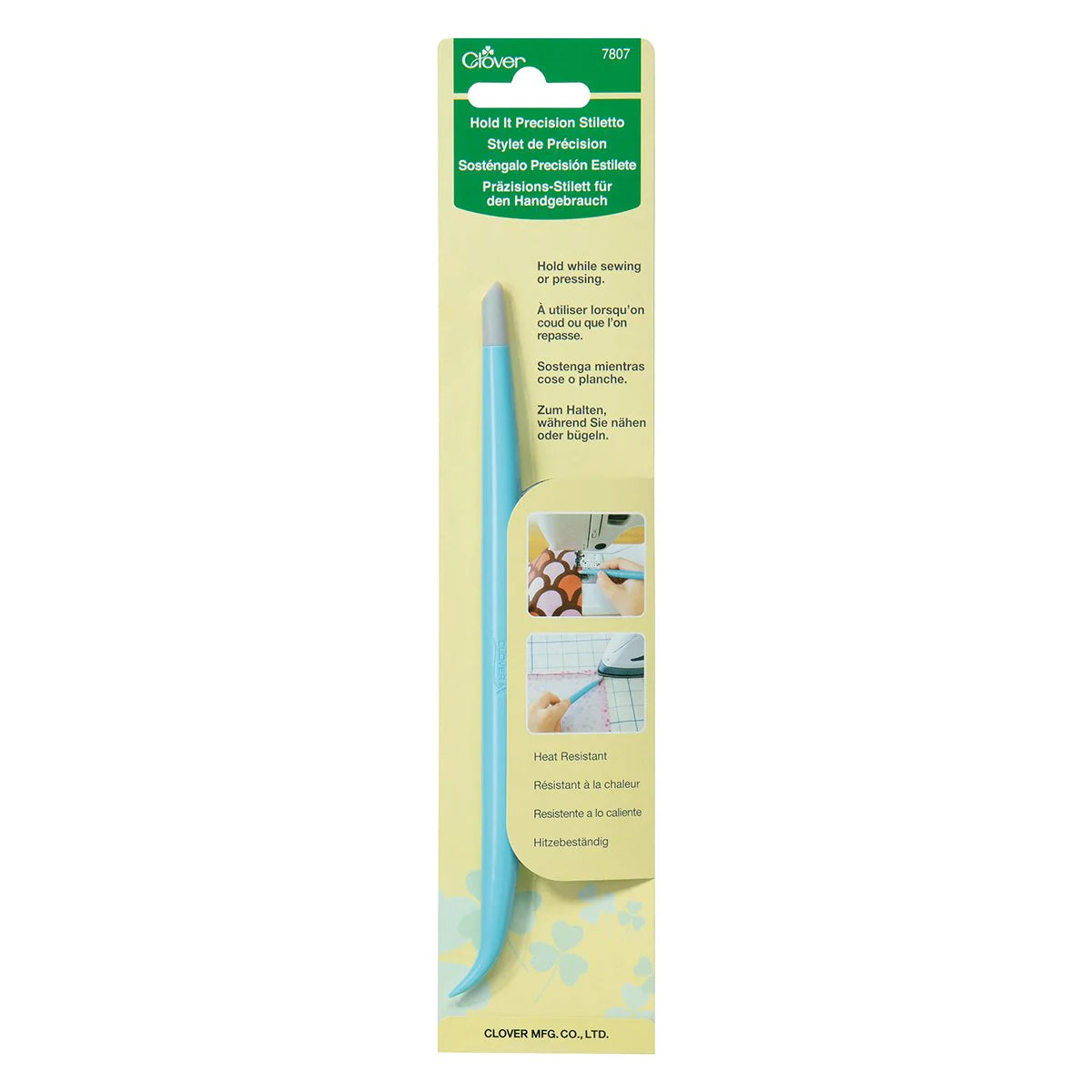 The Clover Hold It Precision Stiletto #7807 is a multi-purpose sewing tool that makes it easy to control fabric on both the sewing machine and ironing board. The heat-resistant silicone tip (up to 230°C) allows you to safely hold fabric near a hot iron. The beveled tip provides good visibility and reach, while the ergonomic shape fits comfortably in your hand.