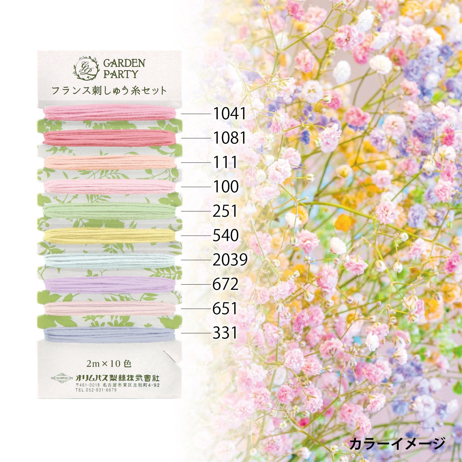 Olympus Garden Party-broderitrådsetet Sweet (OLY-GP-C15) erbjuder 10 trådar i mjuka och harmoniska nyanser, vardera 2 meter långa. Trådarna är praktiskt inslagna i vackra kort, och färgschemat är utformat för fridfulla växtmotiv och små franska broderiprojekt.